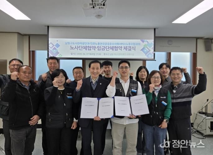 정안뉴스 안정주 기자 | 인천시 남동구도시관리공단은 최근 민주노총 전국공공운수 사회서비스노동조합 남동구도시관리공단 지부와 노사단체협약을 체결했다고 10일 밝혔다.