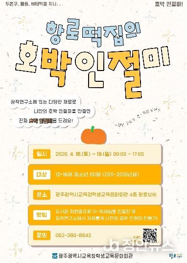 정안뉴스 안정주 기자 | 광주시교육청학생교육문화회관은 오는 18~19일 회관 내 청소년 전용 공간 ‘항로1216’에서 ‘호박 인절미 창작 챌린지’를 운영한다.
