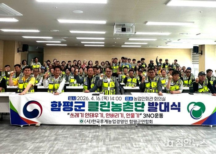 함평군은 16일 “이날 함평군농업인회관 회의실에서 (사)한국후계농업경영인 함평군연합회와 함께 주민 참여형 환경 정화 모델인 ‘클린농촌단’ 발대식을 개최하고 농촌 지역의 고질적인 쓰레기 문제 해결을 위한 3노(NO) 운동’ 실천을 선포했다”고 밝혔다.