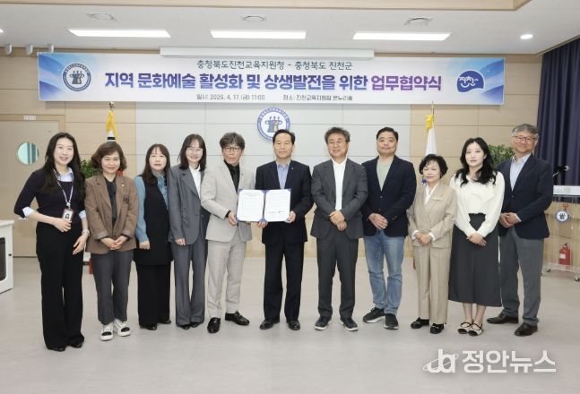 정안뉴스 안정주 기자 | 충북 진천군과 진천교육지원청은 17일 진천교육지원청 온누리홀에서 ‘지역 문화예술 활성화와 상생발전’을 위한 업무협약을 체결했다고 밝혔다.