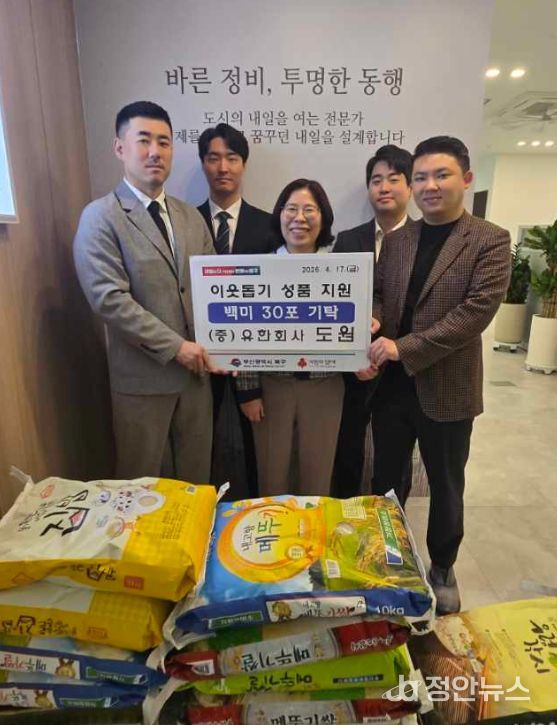 정안뉴스 안정주 기자 | 부산 북구는 지난 17일 유한회사 도원(대표 나의환, 김대환)이 개업을 맞아 화환 대신 백미 30포를 기탁하며 따뜻한 나눔을 실천했다고 밝혔다.