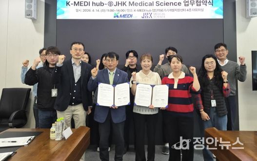 지난 14일 케이메디허브에서 진행된 협약식에는 김헌태 첨단의료기기개발지원센터장과 조서윤 ㈜제이에이치케이 메디컬 사이언스 대표가 참석해 체외진단기기 공동개발과 제품화, 상용화를 위한 업무협약서에 서명했다.