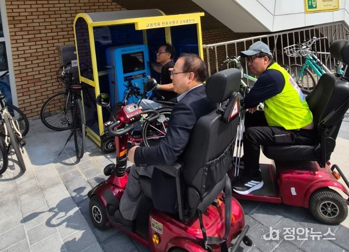 정안뉴스 안정주 기자 | 경기도의회 보건복지위원회 박재용 의원(더불어민주당, 비례)은 지난 17일 양주시 옥정호수공원에서 교통약자를 위한 전동스쿠터 급속충전기 운영 실태를 점검하고, 이용 편의 개선 필요성을 확인했다.