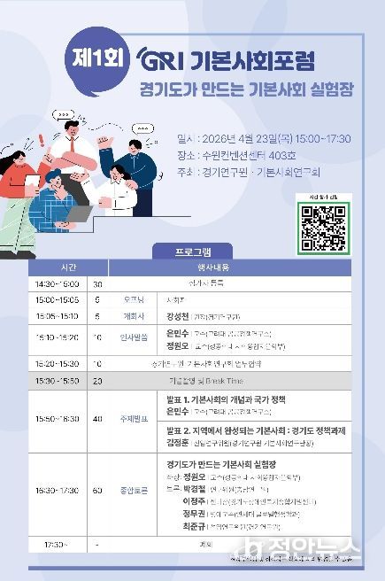 정안뉴스 안정주 기자 | 경기연구원은 오는 23일 오후 3시 수원컨벤션센터 403호에서 ‘경기도가 만드는 기본사회 실험장’을 주제로 ‘제1회 GRI 기본사회포럼’을 개최한다.