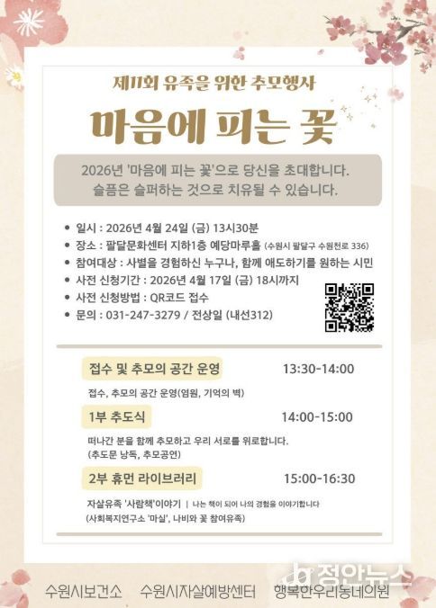 정안뉴스 안정주 기자 | 수원시자살예방센터가 24일 오후 1시 30분 팔달문화센터 예당마루홀에서 유족을 위한 추모행사 ‘제11회 마음에 피는 꽃’을 연다.