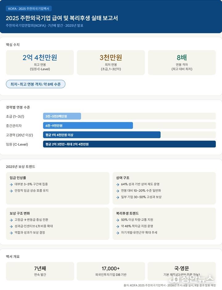 The Korea Organization of Foreign Enterprises (KOFA), led by Chairman Kim Jong-cheol, announced the release of the enhanced edition of the “2025 White Paper on Foreign-Invested Companies in Korea”, unveiling the results of its survey on salaries, bonuses, and employee benefits conducted in June last year.