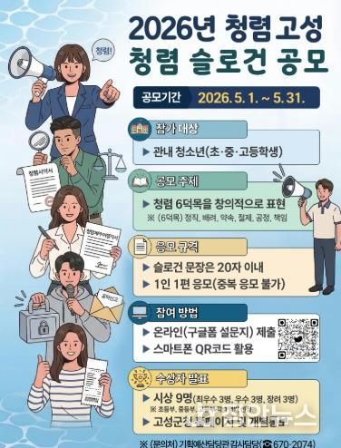 정안뉴스 김재홍 기자 | 고성군은 관내 초·중·고등학생을 대상으로 「2026년 고성군 청렴 슬로건 공모전」을 오는 5월 말까지 실시한다.
