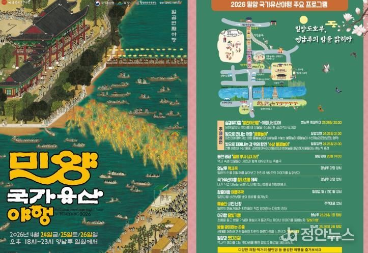 정안뉴스 김재홍 기자 | 경남 밀양시가 주최하고 밀양시문화도시센터가 주관하는 ‘2026 밀양 국가유산 야행’이 오는 4월 24일부터 26일까지 3일간 영남루 및 밀양관아, 밀양강 일원에서 펼쳐진다.
