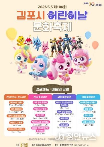 정안뉴스 안정주 기자 | 오는 5월 5일, 김포 전역이 하나의 거대한 놀이공원이 된다. 김포시는 시가 주최하고 김포시청소년재단에서 주관하는 제104회 어린이날 문화축제가 한강신도시호수공원(마산동), 한강중앙공원(장기동), 걸포중앙공원(걸포동), 마송중앙공원(통진읍)에서 동시 개최된다고 20일 밝혔다.