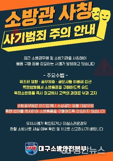 대구소방안전본부는 소방기관 명의의 구매·계약을 빙자한 연락을 받을 경우 즉시 응하지 말고, 반드시 해당 기관의 공식 대표번호를 통해 사실 여부를 확인해야 한다고 강조했다.