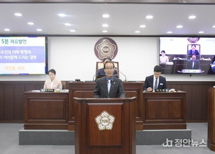 정안뉴스 안정주 기자 | 동두천시의회 박인범 의원(더불어민주당, 나선거구)이 제345회 임시회 폐회식에서 시의원으로서의 마지막 5분 자유발언에 나섰다. 제1대, 제8대, 제9대 동두천시의원과 제8대 경기도의회 의원을 거친 박 의원은 이번 임기를 끝으로 의정활동을 마무리하며, 공직자들에게 '시민이 찾아오는 동두천'을 향한 당부의 메시지를 전했다.