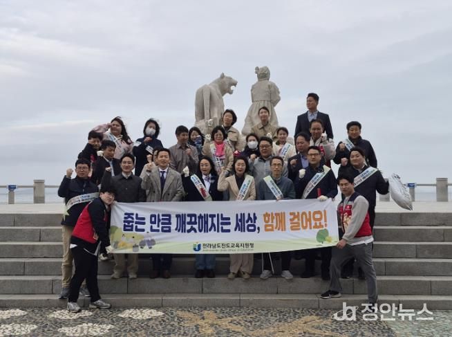 정안뉴스 안정주 기자 | 전라남도진도교육지원청은 4월 20일 진도 신비의 바닷길 축제장 일원에서 교직원의 환경 실천 역량을 높이고 지속가능한 생태환경 조성을 위한 ‘공생의 길 도보 탐사(플로깅)’ 활동을 운영했다.