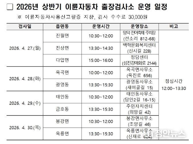 정안뉴스 안정주 기자 | 광양시는 이륜자동차 정기검사의 원활한 추진과 검사소가 없는 지역 주민의 편의를 위해 4월 27일부터 30일까지 한국교통안전공단과 합동으로 2026년 상반기 이륜자동차 출장검사소를 운영한다고 밝혔다.