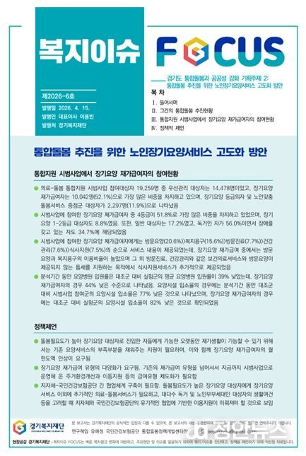 정안뉴스 안정주 기자 | 경기복지재단(대표이사 이용빈)은 통합돌봄 정착을 위한 노인장기요양서비스 고도화 방안을 주제로 '복지이슈포커스 제6호' 보고서를 발간했다.