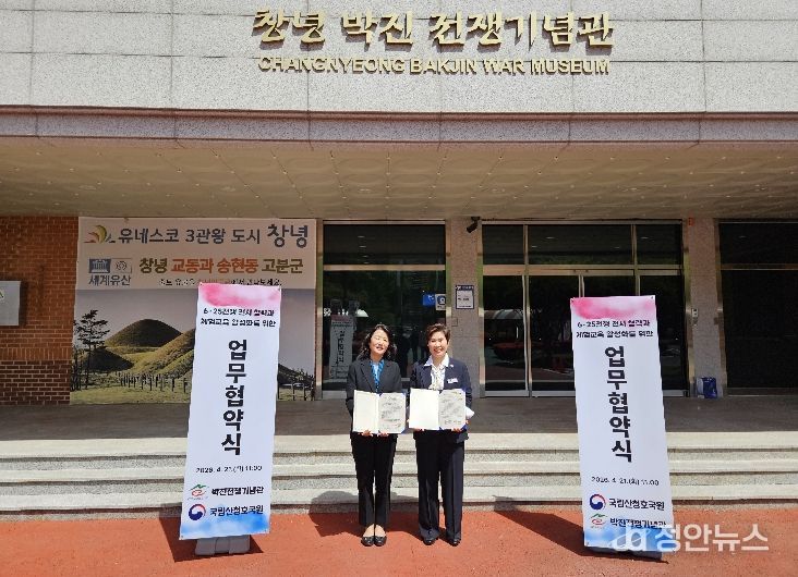 정안뉴스 김재홍 기자 | 창녕군 박진전쟁기념관은 21일, 국립산청호국원(원장 김경나)과 업무협약을 체결하고, 6‧25전쟁의 역사적 가치 계승과 호국보훈 문화 확산을 위한 전시 및 교육 협력 체계를 구축했다.