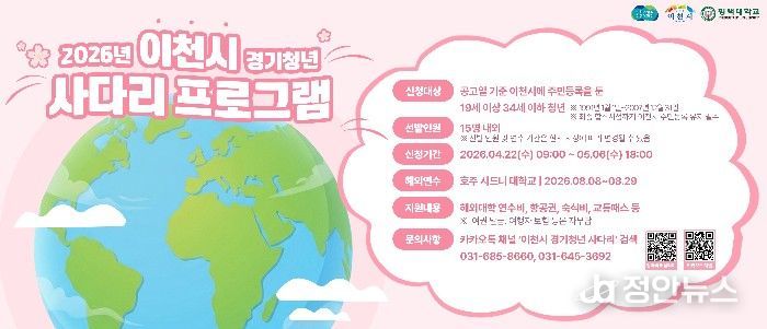 정안뉴스 안정주 기자 | 이천시는 지역 청년들에게 글로벌 경험을 제공하기 위해 '이천시 경기청년 사다리프로그램(운영기관: 평택대학교 산학협력단)' 2기 참여자를 모집한다고 밝혔다.