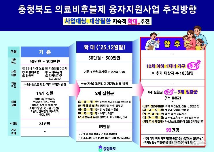 충청북도는 여기에서 더 나아가 지원 대상을 10세 이하 자녀를 둔 한 자녀 가정까지 확대하고, 신경과·외과·피부과·재활의학과 등 4개 질환군을 추가해 기존 5개 질환군에서 총 9개 질환군으로 확대할 계획이다. 이를 통해 보다 촘촘하고 빈틈없는 지원체계를 구축한다는 방침이다.