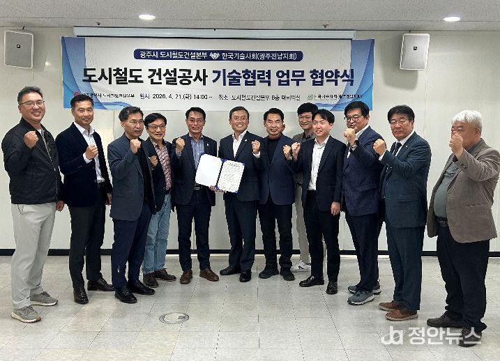 정안뉴스 안정주 기자 | 광주광역시 도시철도건설본부는 21일 본부 8층 대회의실에서 한국기술사회 광주·전남지회와 ‘광주시 도시철도 2호선 건설공사 기술협력 업무협약’을 체결했다.