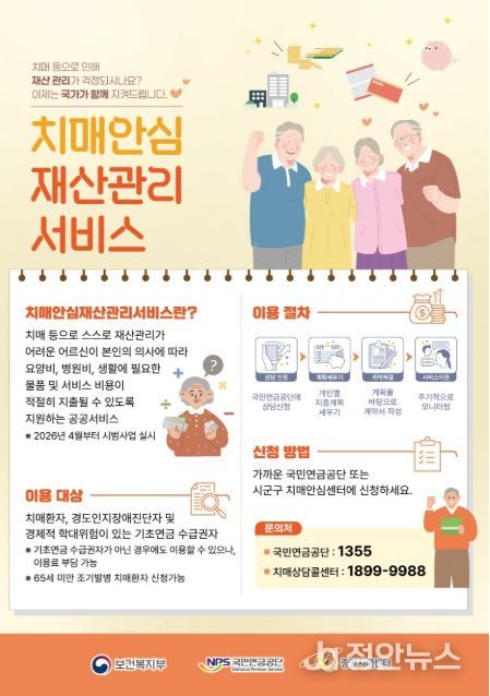 정안뉴스 안정주 기자 | 보건복지부는 4월 22일부터 ‘치매안심재산관리서비스 시범사업’을 실시한다고 밝혔다. 주요 대상은 치매, 경도인지장애 등으로 인해 경제적 학대 위험이 있는 기초연금수급자이며, 국민연금공단 7개 지역본부*에서 상담 받을 수 있다.