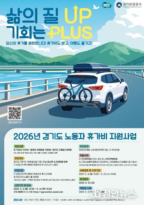 정안뉴스 안정주 기자 | 경기도가 경제적 부담으로 휴식을 포기했던 비정규직과 특수형태근로종사자에게 휴가비를 지원하는 ‘취약노동자 휴가비 지원사업’ 참여자를 5월 4일부터 14일까지 모집한다.