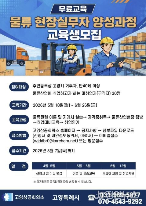 정안뉴스 안정주 기자 | 고양특례시는 2026년 고양맞춤형 일자리학교 공모에 선정된 ‘물류 현장실무자 양성과정’에 참여할 교육생을 오는 5월 7일까지 모집한다.