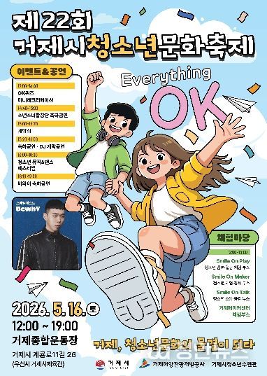 정안뉴스 김재홍 기자 | 거제시는 오는 2026년 5월 16일 12:00~19:00, 거제종합운동장(우천 시 거제시체육관)에서 제22회 거제시청소년문화축제 “Everything OK”를 개최한다.