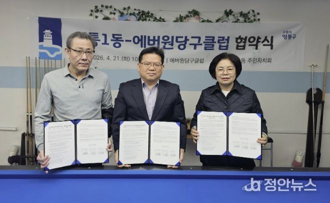 정안뉴스 안정주 기자 | 수원시 영통구 영통1동 행정복지센터와 영통1동 주민자치회는 지난 21일, 주민자치센터 프로그램의 다양성과 전문성을 강화하기 위해 관내 민간체육시설인 에버원당구클럽과 업무협약을 체결했다.