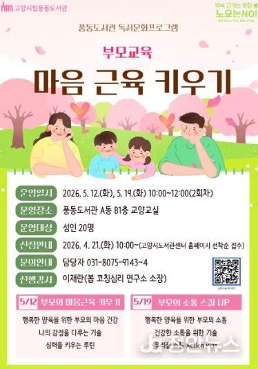 정안뉴스 안정주 기자 | 고양특례시 풍동도서관은 오는 5월 독서문화 프로그램 ‘부모교육, 마음 근육 키우기’를 진행한다고 22일 밝혔다.