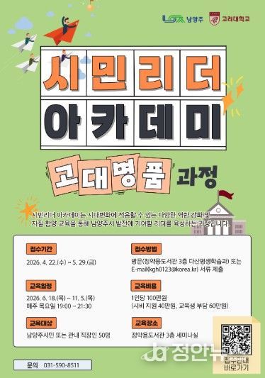 정안뉴스 안정주 기자 | 남양주시는 시민의 자치 역량 강화를 위해 ‘남양주시 시민리더 아카데미’ 제20기 수강생을 모집한다고 22일 밝혔다.
