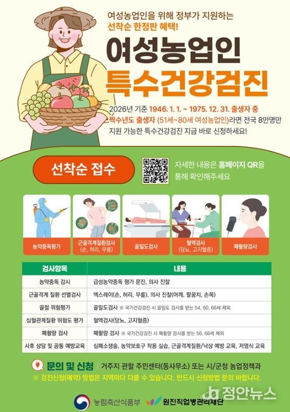 정안뉴스 안정주 기자 | 기장군은 여성농업인의 건강 증진과 복지 향상을 위해 ‘2026년 여성농업인 특수건강검진 지원사업’을 본격 추진한다고 22일 밝혔다.