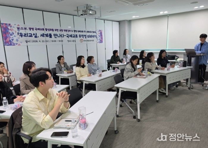 광명교육지원청(교육장 김명순)은 2026년 4월 22일(수) 16:00부터 18:00까지 광명교육지원청 별관 3층 나온실에서 ‘우리 교실, 세계를 만나다’를 주제로 국제교류 역량강화 연수를 운영했다. 이번 연수는 실제 국제교류 운영 사례를 바탕으로 기획됐으며, 교사들이 국제교류에 대한 막연한 관심을 구체적인 실행으로 전환할 수 있도록 돕는 데 중점을 두었다.
