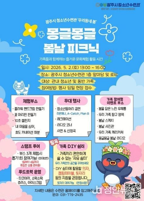 정안뉴스 안정주 기자 | 광주시 청소년수련관은 오는 5월 2일 오후 1시부터 수련관 1층 앞마당 및 로비에서 ‘2026년 우리동네 봄 몽글몽글 봄날 소풍’을 개최한다고 23일 밝혔다.
