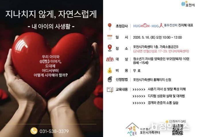 정안뉴스 안정주 기자 | 포천시 직영 더 큰 행복 포천시가족센터는 오는 21일부터 사춘기 자녀를 둔 양육자를 대상으로 부모 교육 프로그램 ‘지나치지 않게, 자연스럽게’의 참여자를 모집한다. 이번 교육은 5월 16일 오전, 포천시가족센터 가족소통공간(반다비체육센터 1층)에서 대면 강의로 진행된다.