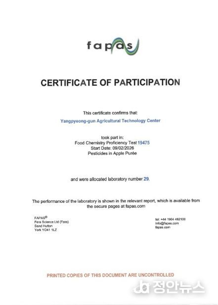 정안뉴스 안정주 기자 | 양평군은 영국 식품환경연구청(FERA)이 주관한 ‘2026년 잔류농약 국제비교숙련도 평가’에서 최고 수준의 분석능력을 인정받아 3년 연속 우수성을 입증했다고 21일 밝혔다.