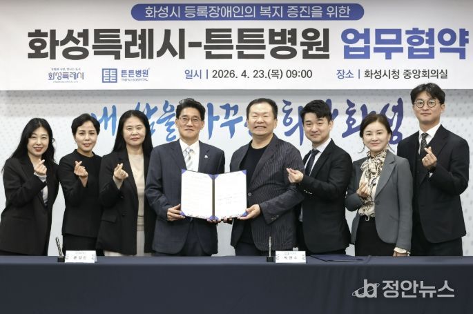 정안뉴스 안정주 기자 | 화성특례시는 23일 본관 2층 중앙회의실에서 튼튼병원과 화성시 등록장애인의 건강한 생활 지원과 삶의 질 향상을 위한 업무협약을 체결했다.