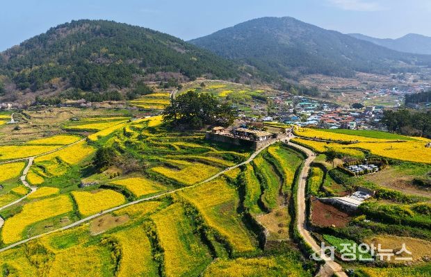 정안뉴스 안정주 기자 | 유채꽃으로 노랗게 물든 청산도 풍광이 눈길을 사로잡는다.