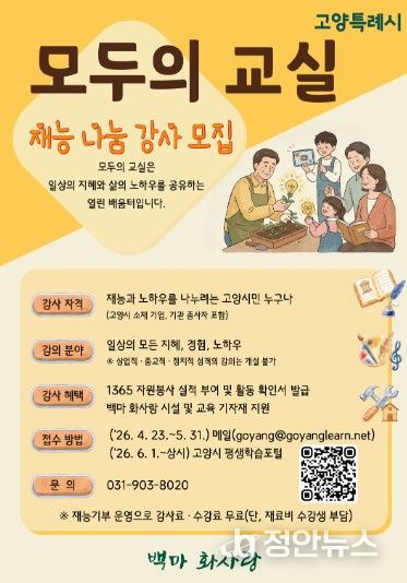 정안뉴스 안정주 기자 | 고양특례시가 올해 시민의 재능을 지역의 배움으로 연결하는 백마 화사랑 ‘모두의 교실’을 운영하며, 재능을 기부할 시민 강사를 상시 모집한다고 23일 밝혔다.