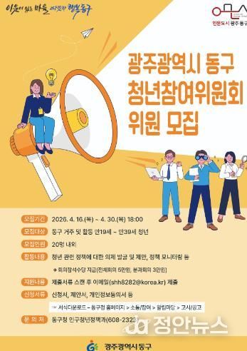 정안뉴스 안정주 기자 | 광주 동구는 청년이 정책의 수혜자를 넘어 정책의 주체로 참여하고, 지역 변화를 이끌어갈 ‘제6기 청년참여위원회’ 위원을 공개 모집한다고 밝혔다.