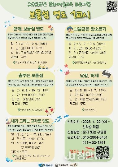 정안뉴스 안정주 기자 | 부산시 영도구는 지역 자원을 활용한 영도형 문화예술교육 프로그램인 ‘보물섬영도 1교시’ 참여자를 오는 5월부터 본격 운영한다.