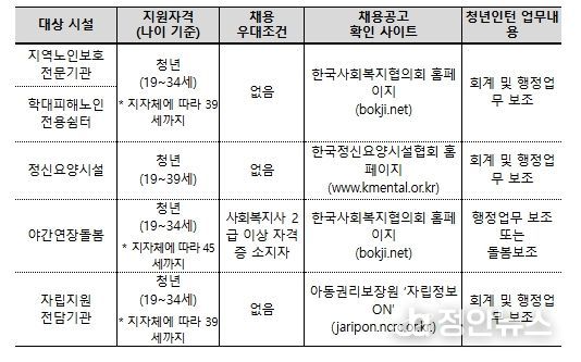 이번 모집을 통해 선발되는 479명의 청년인턴은 전국 아동·노인·정신요양 시설 등 5개 유형의 시설에서 근무하게 된다.