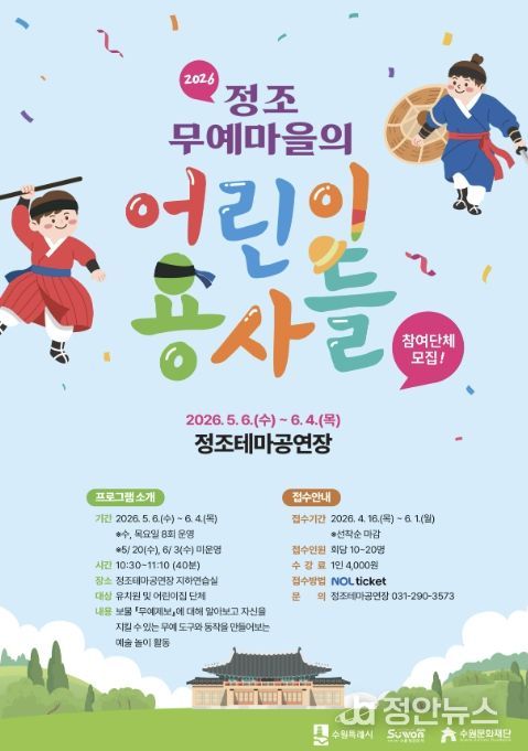 정안뉴스 안정주 기자 | 수원문화재단 정조테마공연장의 대표 예술교육 프로그램 '정조무예마을의 어린이 용사들'의 상반기 교육이 접수 마감되며 큰 호응을 얻고 있다.
