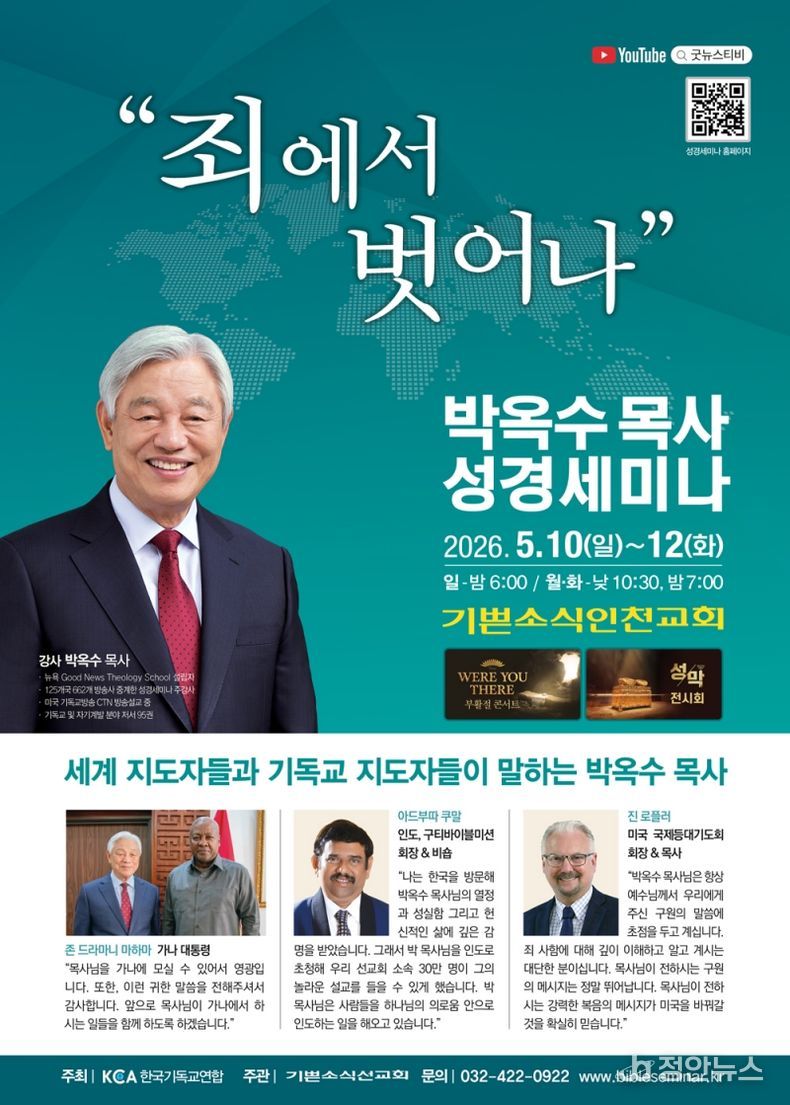 정안뉴스 안정주 기자 | ‘2026 박옥수 목사 성경세미나’가 5월 10일(일)부터 12일(화)까지 3일간 기쁜소식인천교회에서 열린다.