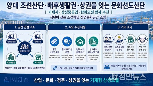 정안뉴스 김재홍 기자 | 거제시가 삼성중공업, 한화오션과 체결한 지역상생발전 협약을 바탕으로 양대 조선산업단지와 인근 배후생활권, 지역상권을 함께 잇는 문화선도산단 조성사업 공모 준비에 본격 나선다.