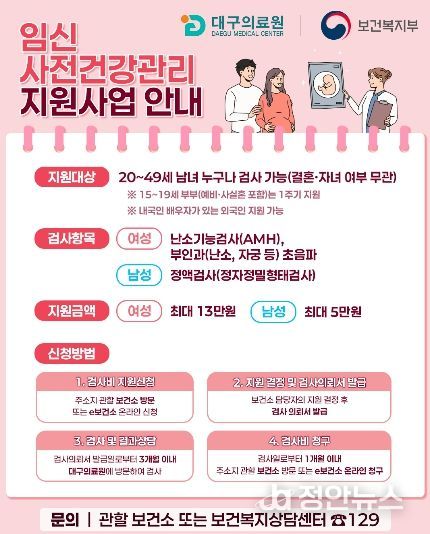 정안뉴스 안정주 기자 | 대구의료원 난임센터는 임신·출산에 장애가 될 수 있는 건강 위험요인을 조기에 발견하기 위한 ‘임신 사전건강관리 지원사업’ 참여의료기관으로 선정돼, 지역 주민의 건강한 임신·출산 환경 조성을 적극 지원한다.