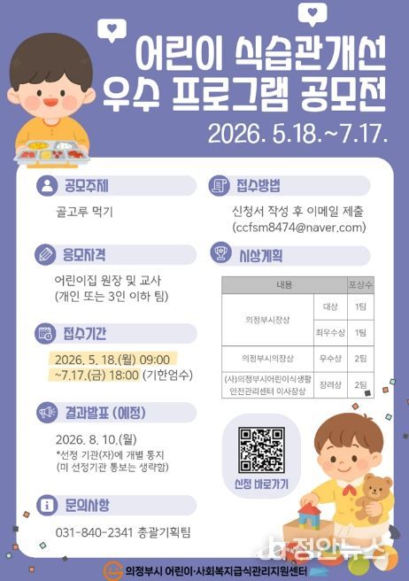 정안뉴스 안정주 기자 | 의정부시가 운영하는 의정부시 어린이‧사회복지급식관리지원센터는 어린이 보육시설을 대상으로 5월 18일부터 7월 17일까지 ‘어린이 식습관 개선 우수 프로그램 공모전’을 개최한다.