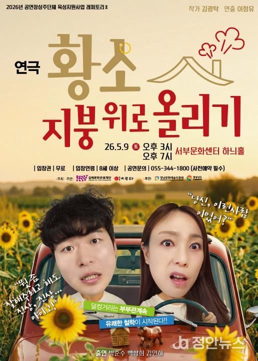 정안뉴스 김재홍 기자 | (재)김해문화관광재단 김해서부문화센터는 경남문화예술진흥원이 주관하는 ‘2026 공연장상주단체 육성지원사업’에 선정되어, 오는 5월 9일 두 번째 레퍼토리 공연 연극 '황소, 지붕위로 올리기'를 선보인다.