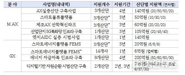 산업부는 2019년부터 현재까지 24개 산업단지를 스마트그린산단으로 지정했으며, 스마트그린산단을 대상으로 AX 실증산단 구축, 에너지 자급자족 인프라 구축 등 산업단지의 M.AX와 GX를 위한 스마트그린산단 지원사업을 추진 중이다.