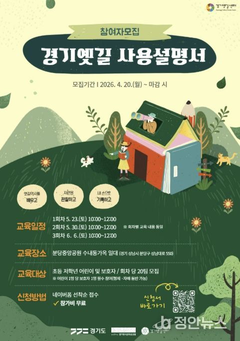 정안뉴스 안정주 기자 | 경기문화재단 경기역사문화유산원은 초등 저학년 어린이와 보호자를 대상으로 하는 역사문화예술 프로그램 ‘경기옛길 사용설명서’ 참가자를 모집한다고 밝혔다.