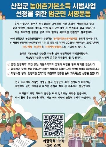 정안뉴스 김재홍 기자 | 산청군은 ‘농어촌기본소득 시범사업 선정 기원 범군민 서명운동’에 돌입했다고 29일 밝혔다.