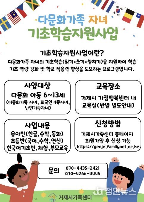 정안뉴스 김재홍 기자 | 거제시가족센터는 다문화가족 자녀의 학교생활 적응과 기초학습 능력 향상을 위해 ‘다문화가족 자녀 기초학습지원 사업’을 운영하고 있다.